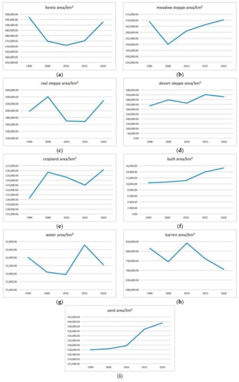Trend of land cover area change in Mongolian Plateau: (a) forest area; (b) meadow steppe area; (c) real steppe area; (d) desert steppe area; (e) cropland area; (f) built area; (g) water area; (h) barren area; (i) sand area.