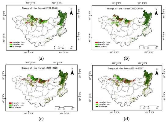 The forest transfer diagrams: (a) 1990–2000; (b) 2000–2010; (c) 2010–2020; (d) 1990–2020.