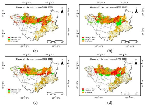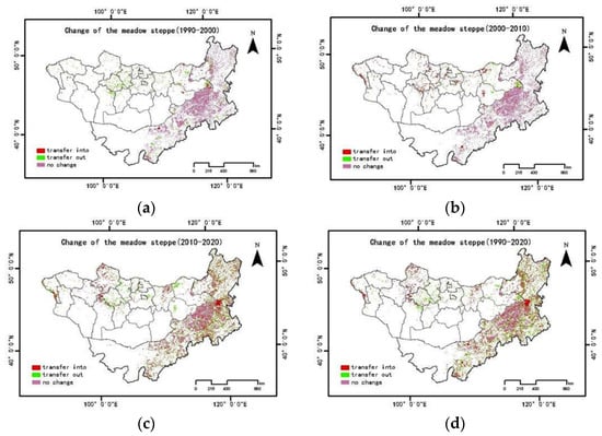 Meadow steppe transfer diagrams: (a) 1990–2000; (b) 2000–2010; (c) 2010–2020; (d) 1990–2020.