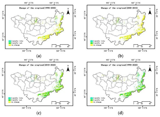 Croplands in Mongolia are mainly distributed in the Selenga River Basin and Valley because of sufficient precipitation and good irrigation conditions. In Inner Mongolia, the croplands are in the central and eastern regions (Figure 8). The total cropland area increased from 1990 to 2000 and from 2015 to 2020. It decreased between 2000 and 2015 (Figure 3e). The largest increase from 2015 to 2020 was 0.52%, and from 2010 to 2015 it was 0.26%. Compared to 1990, the cropland area increased by 5891.68 km2 in 2020. The rate of change over the past 30 years has been 0.16%.