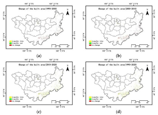 The built area on the Mongolia is concentrated in the capital of Ulan Bator. The built area in Inner Mongolia, China is distributed throughout various regions (Figure 9). As shown in Figure 3f, the total built area has increased. The greatest increase observed between 2010 and 2015 was 5.15%. Compared to 1990, the built area had increased by 4901.78 km2 by 2020. The average observed rate of change in the 1930 years was 1.57%.