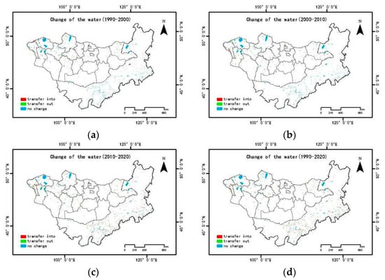 The Mongolian Plateau is the origin of many rivers, including the Selenga River, Helun, Helal, and Erguna. They are generally located in the northwest region (Figure 10). The total water area increased between 2010 and 2015 and decreased during the other study periods (Figure 3g). The average observed rate of increase from 2010 to 2015 is 0.46%. The highest observed rate of decrease from 2015 to 2020 was 0.30%. The water area decreased by 180.88 km2 between 1990 and 2020. The average observed rate of change over 30 years was −0.02%.