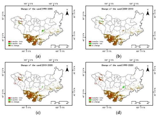 The sand areas on the Mongolian Plateau are concentrated in western Inner Mongolia and western Mongolia. These sand areas are distributed among the Badan Jaran, Tengger, and Ulan Bu deserts. Additional sand areas were also located within the Zabu Khan Province and the Gobi region in Mongolia (Figure 12). The total sand area increased between 1990 and 2020 (Figure 3i). The increase rate varied for each decade. The largest increase occurred from 2010 to 2015, when it reached 0.61%. Compared to 1990, the sand area increased by 11,488.36 km2 by 2020. The average observed rate of change over the past 30 years was 0.17%.