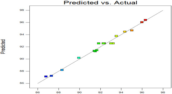 ANOVA is a statistical tool which can be utilized for the yield validation as exhibited in Table 5. Model F-value of 52.87 exhibits model significance. The probability of this much larger F-value is 0.01% and it may be because of noise. Less than 0.0500 “Prob > F” values exhibit that the terms of model are significant. A, C, AB, AC, and B2 in the present scenario are significant terms. The terms having values greater than 0.1000 are insignificant. A more insignificant term means that there is a model reduction requirement. “Lack of Fit F-value” of 0.56 demonstrates that it is not significant with respect to pure error. There is 67.03% probability of this large “Lack of Fit F-value” may be because of noise. Non-significant lack of fit is good.