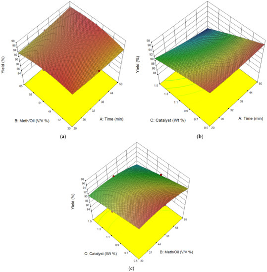 Reaction parameters’ effect on yield percentages is exhibited in Figure 3 in the form of 3D surface plots by keeping two of them constant at a time. Methanol-to-oil molar ratio is varied between 30 and 65 v/v to examine its variation impact on biodiesel yield. Figure 3 exhibits methanol-to-oil molar proportion impact on yield along with response time and catalyst concentration. It was observed that the increment of methanol-to-oil molar proportion increases yield. Furthermore, reaction temperature and catalyst concentration should also be optimized to increase solubility and improve the reaction rate [45]. At lower methanol-to-oil ratios, the reaction time increases but it decreases at higher levels of methanol yield due to excess methanol from the separation of alkyl ester and glycerol increasing solubility [46,47]. This contributes to dilution in one part of the remaining glycerol in alkyl ester process which causes ester loss due to soap formation. Likewise, glycerol presence shifts balance back to left leading to yield reduction. That is why an optimum methanol-to-oil ratio is necessary. Methanol-to-oil molar ratio of 47.5 v/v % gives highest yield. Elliptical form of the surface response map suggests a fairly large relationship between the surface response charts factor. Influence of concentration of catalyst (KOH) on the yield of biodiesel was determined from 0.5 to 1.5 w/w. Excess catalyst concentration (more than 0.5 w/w) can also reduce yield and cause difficulty in aqueous layer separation (more saponification) during washing. Excessive catalyst will also result in obtaining a very viscous biodiesel which cannot be used as fuel for engines. The maximum yield of biodiesel produced is obtained at 0.5 w/w catalyst concentration. In addition, an inadequate catalyst concentration in reaction culminated in a decrease in the production of methyl ester [48].