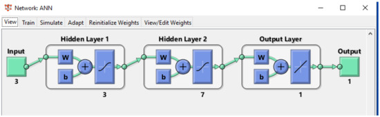 After RSM, verification and validation of output responses is conducted via artificial neural network. For this purpose, the feed-forward backprop ANN network was selected with ‘TRAINLM’ training function, ‘LEARNGDM’ Adaption learning function, and ‘MSE’ as a performance function. The ANN model utilized three input, two hidden, and one output layers with three, three, seven, and one neurons accordingly. These layers have transfer functions as ‘logsig’, ‘tansig’, and ‘purelin’, as demonstrated in Figure 4 and Figure 5.