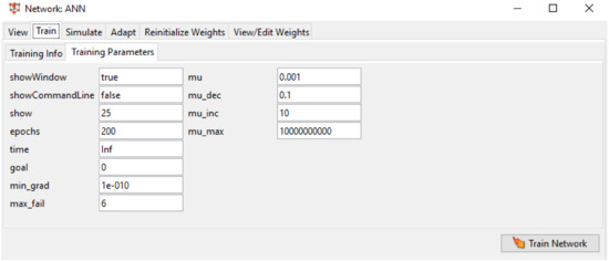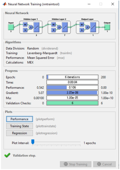 Feedforward ANN model was utilized for training via experimental data of Table 4. For network training, “trainlm” function is utilized to updates weight values and bias according to Levenberg–Marquardt optimization. Maximum training epochs are 200 and MSE is 0.0001. Other training parameters of artificial neural network are exhibited in Figure 6.