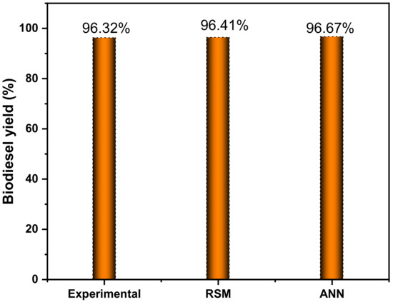 Comparison of experimental biodiesel yield with RSM and ANN models.
