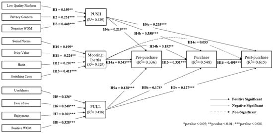 Push effect is the negative perceived effect driven by the use of other services which may happen because of failure of the system, application, or service. For example, privacy disclosure issues, service provider security issues, pricing issues, or negative WOM of using the applications or services could lead to less satisfaction and trust. Push effect happens from the beginning of the process of purchasing, including the stage of searching for information, decision making, and after the purchasing of products or services. These actions can create awareness of the application’s value on the side of the user. Research studies on the Push effect [1,46,47] indicated that it is a factor that strongly influences online commerce. Therefore, this research hypothesized that the Push effect influences the purchasing decision process on the online shopping application at the Pre-purchase, Purchasing, and Post-purchase stages.