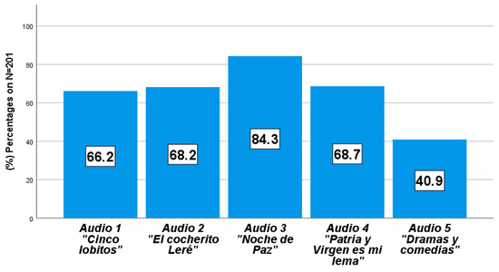 Concerning the importance of keeping musical heritage alive, 59.5% rate this as very important alongside another 36.5% that consider it important. Consequently, the total mean of the sample is 4.55 points out of 5. Barely 1% considered it not very important. After reproducing five audio clips, the students were asked whether they belonged to musical heritage or not. The sense of belonging was highly attuned in general (See Figure 3). They include no. 3, “Noche de paz,” voted by 84.3% of the sample, followed by no. 4, “Patria y virgen es mi lema,” with the agreement of 68.7%, and no. 2, “El cocherito leré,” with a representation of 68.2% of the respondents. At the other end of the scale, the least voted was no. 5, “Dramas y comedias,” by 40.9%.
