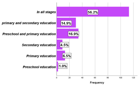Concerning the relevance of musical heritage in the curricula of the educational stages (See Figure 4), the responses obtained clearly show that over half of the respondents believe they are relevant in all stages (56.2%), 16.9% say they are relevant in both preschool and primary education, and 14.9% answer in both primary and secondary education. Only 1% believe that the stage where inclusion of this type of heritage is most necessary is preschool.