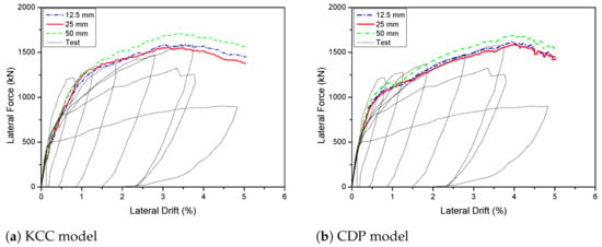 Figure 4 depicts the findings of a mesh size influence study including three distinct mesh sizes: 12.5 mm, 25 mm, and 50 mm. The force–displacement relationships do not improve considerably as the mesh sizes are 12.5 mm and 25 mm. The concrete wall was divided into two sections meshed with a 25 mm and 50 mm size, and the beams were meshed with a 25 mm size to reduce computing time. As shown in Figure 3b, the foundation and upper part elements had a larger mesh size (e.g., 100 mm) than the primary structural elements (i.e., wall, beam).