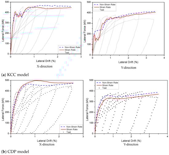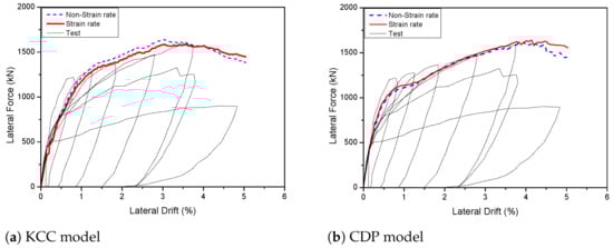 The force–displacement findings of PT 2D walls with strain rate effects are as shown in Figure 7. The strain rate effects have no effect on the force–displacement relationships of the KCC and CDP models, whereas the Winfrith models were affected by strain rate and were best used with RATE = 1. The key parameters of the hysteresis diagrams are as shown in Table 3.