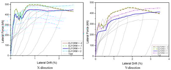 Under pushover loading, the 3D wall was tested on three concrete models. In Figure 10, Figure 11 and Figure 12, the analytical results of the 3D wall utilizing various concrete models such as KCC, CDP, and Winfrith are compared to the corresponding experimental data. To validate the mesh size effects, the experimental findings were compared to the hysteresis and backbone curves derived from the FEA with three sizes: 12.5 mm, 25 mm, and 50 mm, as shown in Figure 10. The force–displacement relationships do not change significantly since the mesh size for the displacement–force curve in the X direction in three models is 12.5 mm and 25 mm, whereas the mesh size for the Y direction results is 12.5 mm, 25 mm, and 50 mm. The concrete wall was divided into two parts meshed with a 25 mm and 50 mm size, and the beams were meshed with a 25 mm size to reduce computing time. As shown in Figure 9c, the foundation and upper part elements had a larger mesh size (e.g., 100 mm) than the primary structural elements (i.e., wall, beam). As indicated in Figure 11 and Figure 12, the concrete element and strain rate had a profound influence on the displacement–force curve results. In LS-DYNA, there are four sorts of solid elements that are widely used: The solid element types ELFORM = 2, −1, 1 and 2 are often employed. In three models, the concrete element (ELFORM = 1) was a reasonable forecast for the displacement–force curve in both the X and Y directions, as illustrated in Figure 11. The CDP and Winfrith models performed well because they did not account for the strain rate effect in both the X and Y directions, and RATE = 1 was appropriate for the Winfrith model. The KCC model, on the other hand, provided an acceptable forecast for both the X and Y directions, as shown in Figure 12. Table 4 and Table 5 show the findings of the maximum displacement–force hysteresis diagrams.