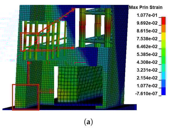 The maximum principal strain fringe will be used to examine the damage mechanism and pattern of this model. The color palette is to be used in the maximum primary strain fringe to calculate the damage zone in the wall, including the damaged concrete and rebars, similar to the explored standard for 2D wall damage. Figure 13 illustrates structural damage reproduced from the finite element model for the 3D wall. The KCC model can predict maximum tensile regions in beams and recognize localized failure, but it is not totally correct for concrete failure since the color range visible for concrete only extends to the top of the main color palette, as shown in Figure 13a. The CDP and Winfrith models, on the other hand, can reliably detect the location of concrete failure as well as the maximum tensile regions in rebars by detecting the color range for concrete and rebars at the peak of the color palette in the maximum principal strain fringe, as shown in Figure 13b and Figure 13c, respectively.