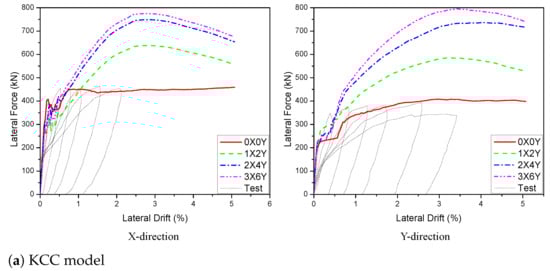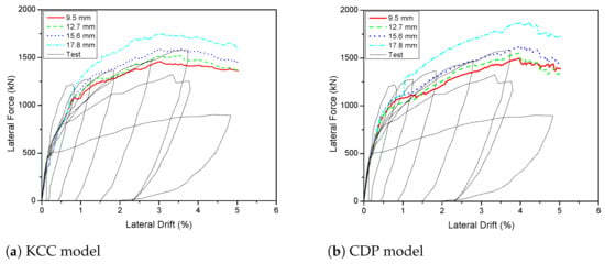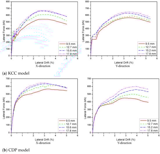 There are four scenarios of PT diameter studied to response of the 3D wall behaviour—9.5 mm, 12.7 mm, 15.6 mm, and 17.8 mm. The effect of the PT diameter on the load–displacement curve is shown in Figure 26. In general, the maximum lateral load of the specimen in Figure 26 was improved by changing the PT diameters. According to these plots, when the diameter was improved from 15.2 mm to 17.8 mm, the peak load was increased 1.2% (KCC model), 1.7% (CDP model), 6.7% (Winfrith model) for the X direction and 3.0% (KCC model), 7.2% (CDP model), 9.5% (Winfrith model) for the Y direction. In contrast, concerning the change of diameter from 15.2 mm to 12.7 mm, the peak load decreased 7.7%, 3.5%, and 6.3% for the KCC, CDP, and Winfrith models, respectively, for the X direction, as well as 6.7%, 10.8%, and 7.8% for the KCC, CDP, and Winfrith models, respectively, for the Y direction. Similarly, when the diameter decreased from 15.2 mm to 9.5 mm, the peak load decreased 18.3%, 10.5%, 7.7% for the X direction and 10.7%, 19.8% and 16.8% for the Y direction of the KCC, CDP, and Winfrith models, respectively. This indicated that the 15.2 mm is the best option for enhancing bearing capacity of lateral strength for the 3D wall for three models as shown in Figure 27. Table 11 and Table 12 show the details of the parameters.