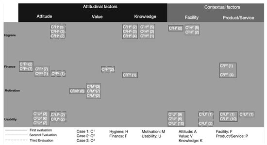 This section illustrates the application of behaviour change strategies to address the user acceptance issues. First, the adapted TABC was applied in order to allocate these four user acceptance issues (identified in Section 4.2) according to the definitions of the attitudinal and contextual factors. For instance, regarding hygiene issues, some data indicate that participants may have inaccurate knowledge of how the packaging is washed, resulting in the objection to the reusable packaging solutions. Therefore, this issue can be allocated to the attitudinal factor of knowledge. However, other participants may perceive the facilities (e.g., dispenser) as unhygienic, and thus this issue can be allocated onto contextual factor of the facility. Figure 3 shows the allocation of these issues from three evaluations onto the adapted TABC. To clarify, Case 1, Case 2 and Case 3 are represented by C1, C2 and C3. The number in the parentheses refers to the number of participants arguing this issue. The issues of hygiene, finance, motivation and usability are represented by H, F, M, U. The attitudinal (i.e., attitude, value and motivation) and contextual factors (i.e., facility and product/service) are represented by A, V, K, F and P, accordingly. For instance, C1HK (2) refers to two participants arguing that Case 1 has hygienic issues (knowledge factor).