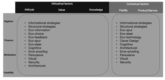 Moreover, De Medeiros et al. [45] performed a study to evaluate similarities among these aforementioned strategies. Accordingly, the framework was developed to support the process of applying the behaviour change strategies to influence attitudinal and contextual factors. Because the strategies from Steg and Vlek [35] are explicitly related to attitudinal factors and contextual factors, their strategies can be also incorporated into the framework. Table 2 shows the adapted framework, which offers the guidelines for the application of behaviour change strategies to influence attitudinal and contextual factors.