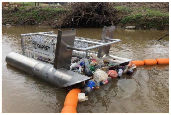 The device used in this study is the Litter Gitter, an innovative device for in-stream litter collection with similar characteristics to other comparable devices used globally, such as The Bandalong Bandit, The Water Goat, Trash Trout, and Sungai Watch’s floating Barriers. The Litter Gitter (LG) is a small in-stream collection device developed by Osprey Initiative, LLC, and is designed to intercept floating litter from stormwater runoff. It includes floating booms that use the current to guide trash to a large wire-mesh collection container (shown in Figure 1). The boom system does not have any nets or barriers that suspend through the water column; thus, limited harm will be made to fish and other wildlife. Litter Gitters have been used widely (43 currently deployed throughout the U.S.) in inland streams to capture floating litter.