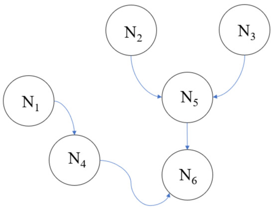 The six variables shown in Figure 2, N1, N2, N3, N4, N5, and N6 in Equation (1) can be simplified because the primary node of each node is known. For example, we recognize that has exactly one primary node, N1. Thus, the joint probability distribution of can be replaced with , given that only N1 has a significant contribution to the existence of N4. The balanced joint probability distribution variables are delivered in Equation (2).