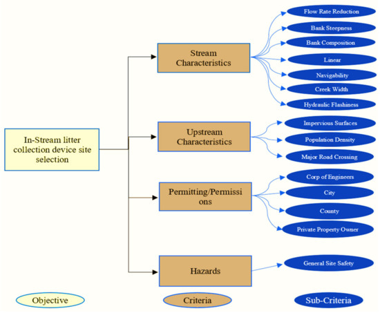 - Problem definition and systematic study: Systematically identifies the necessary criteria and sub-criteria required to site an LG for collecting marine litter in a coastal area. Professional input, accessible literature, and elementary LG installation procedures, as instructed by the Environmental Protection Agency (EPA), the U.S. Army Corps of Engineers (USACE), and the National Oceanic Atmospheric Administration (NOAA) [3,4], were utilized to create the criteria and sub-criteria. Overall, four criteria and fifteen sub-criteria are identified to evaluate a possible site for installing the LG (see Figure 3).