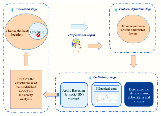 - The preliminary stage: Includes collecting data, formulating, and modeling stages. A suitable link between the criteria and sub-criteria is constructed. Related data are gathered to build the BN model with the information collected via the first stage, and a BN model is constructed for each potential site.