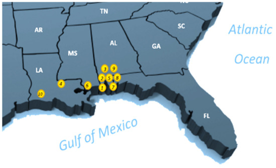 More than fifty sites in the U.S. were initially studied. Ten candidate sites in the coastal area in the south of the U.S. were finally chosen based on their potential success to potentially install LGs. Figure 5 visualizes the ten candidate sites. The specific locations of the candidate sites are listed in Table 1. These potential locations have a common characteristic to ensure initial successful scenarios. For instance, permitting or permission criteria from the city governorate are mandatory for installing such a project. The model takes these criteria as a base requirement for the project. This section shows a BN model using Agena Risk (https://www.agenarisk.com, accessed on 31 March 2022) software for evaluating the possible location of the LG.