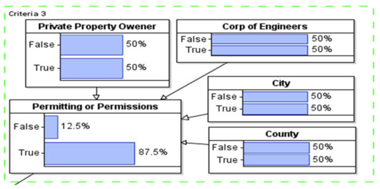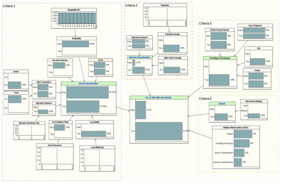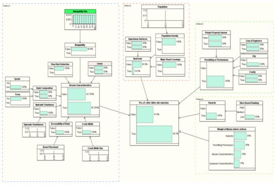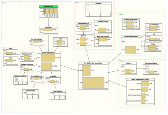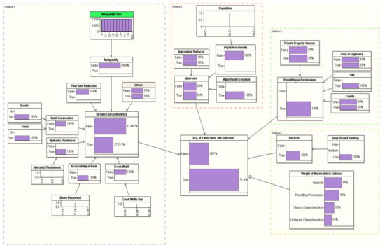 The proposed model was developed using the BN theory. There are four criteria in the proposed model: (i) stream characteristics, (ii) upstream characteristics, (iii) permitting or permission, and (iv) hazards criteria. Based on a professional’s input and literature review, the priority ranking of these criteria is as follows. Permitting or permission (of city, counties, or municipality) is considered the top priority, as permission is mandatory for the project. If permission cannot be granted, the trap cannot be placed at the suggested location. The stream characteristics are considered the second priority since it covers the technical parts of the LG trap project. Without ensuring the availability of all needed requirements, an LG trap cannot be placed. The stream characteristics sub-criterion covers technical parameters that affect crew safety and are considered essential for placing an LG trap. Among all other criteria, the third priority is the upstream characteristics that cover an LG’s potential trash capacity and economic criteria.