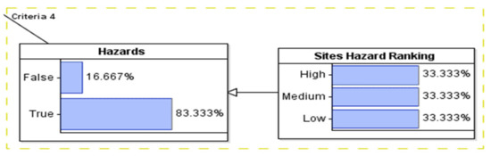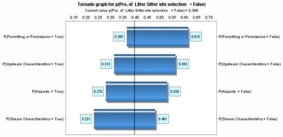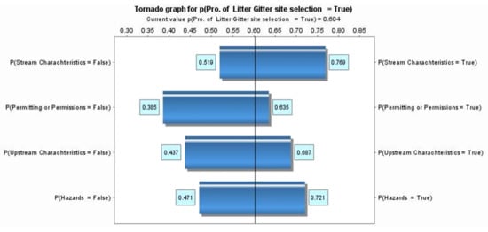 Hazard in the tornado graph explains that the probability of selecting the first LG location (“true”) starts from 0.47 (when the hazard criteria is “false”) to 0.72 (when a hazard criterion is “true”). The probability of selecting the first litter location is 0.6, given that the hazard criteria is achieved. This range (0.47–0.72) is precisely the bar in the tornado graph explained in Figure 13. For permitting criteria, upstream characteristics, and stream characteristics criteria, the probability of selecting the first LG location is 0.39–0.64, 0.44–0.69, and 0.52–0.77, respectively.