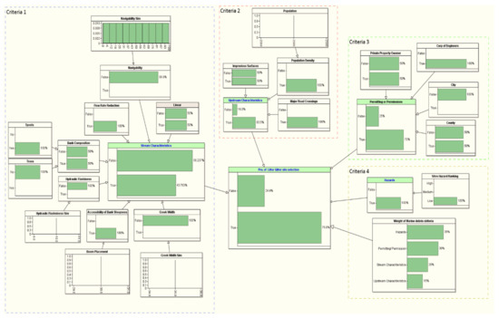 Validation is utilized to compare the current constructed model to the actual result. In Figure 13 and Figure 14, tornado graphs are used to demonstrate the importance of the nodes in determining the probability of selecting a candidate LG site. The variables in the chart are represented in boxes with two conditions, “true” and “false.” The longer the box, the greater the influence on determining the probability of the candidate LG sites (target node). The tornado graph shows hazards, permitting, upstream characteristics, and stream characteristics criteria with a rough difference of 0.25. The analysis of the tornado chart indicates different influences among all criteria. Therefore, we can say that there is a similar influence on the target node among all criteria.