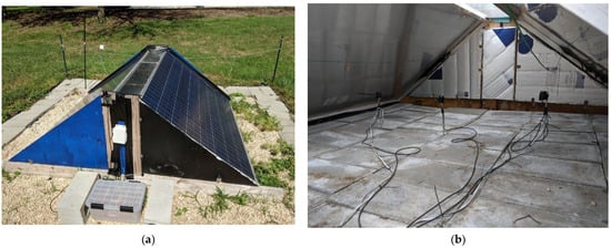 As shown in Figure 2b, the base of the test cell was covered with low-density concrete blocks of density 1920 kg/m3, which added thermal mass to the system to attempt to make cell air temperatures more uniform over short times. Three total solar radiation pyranometers, two temperature, and two RH sensors were installed in the test cell, as shown in Figure 2b. The internal sensors were positioned about 1.3 m from the south-facing sidewall and about 65.3 cm from each other and from the east- and west-facing PV panels. A pyranometer and temperature, RH, wind speed, and wind direction sensors were installed outside of the test cell to collect ambient data. Manufacturers, models, and specifications of sensors used are presented in Appendix A.