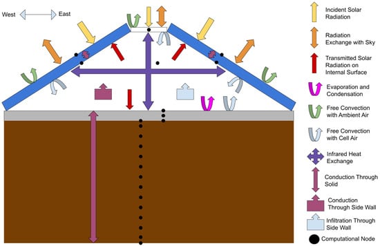 Vanthoor suggested that a comprehensive greenhouse model should consider internal temperature, relative humidity (RH), and CO2 concentration []. Nearly all thermal models in [] were locally 1-D transient models, with the discrete components considered as lumped masses. The models differed in regard to the other factors considered. Combinations of RH, CO2 concentration, and heat flow due to certain heat transfer modes were neglected in many of the models. Jouid et al. [] neglected the evaporation of water from the soil, assumed there was no water in the greenhouse soil, and assumed there were no plants in the greenhouse. Mohammadi et al. [] assumed that there were no crops in the greenhouse, i.e., no evapotranspiration in the greenhouse, a negligible effect of CO2 concentration on evapotranspiration, and no evaporation from the soil. They also assumed that any water condensed on the inside of the roof or screens was removed from the system. Cooper and Fuller [] neglected edge losses, and Sethi [] neglected radiation heat exchange between the walls and the roof, which we note below is not negligible.