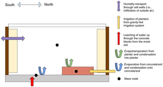 Mass transfer nodes and interactions in the computational model. The white bar is the transparent polycarbonate, the brown bars are wood side walls, the tan bars are foam board insulation, the red rectangle represents planters, and the grey rectangle is the concrete block.
