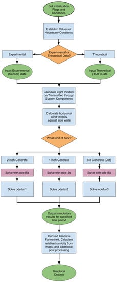 The thermal and moisture transport models are solved using the algorithm below in Matlab (Mathworks, Natick, MA, USA) with the integration package ODE15s. See Figure 5 and Figure 6.