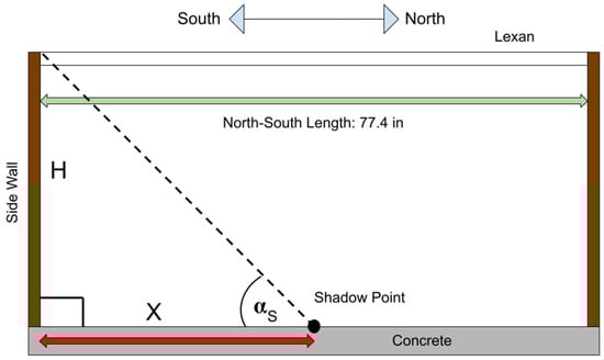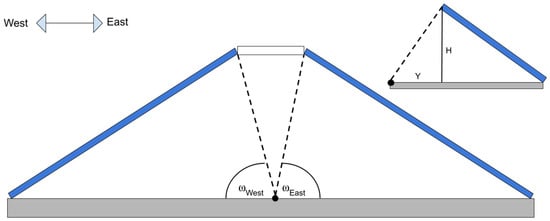 The shadow projection point SP is the distance in the north–south direction, measured from the base of the south-facing side wall (see Figure 7). It determines the length of the shadow projected by the sidewall. The value of cos(ω) was found from []. A point must be at a distance greater than SP from the south-facing side wall to be sunlit.