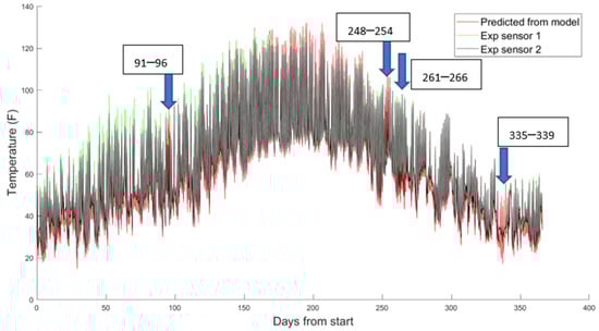 Yearlong simulation results and experimental temperature data. “Exp sensor 1” refers to the temperature sensor located on the east side of the test cell base, and “Exp sensor 2” refers to the sensor on the west side. Periods of sensor interruption or snow cover, where data were linearly interpolated, are highlighted.