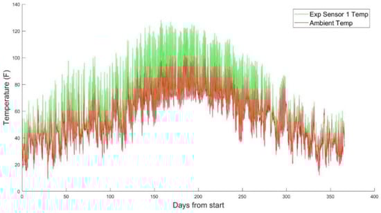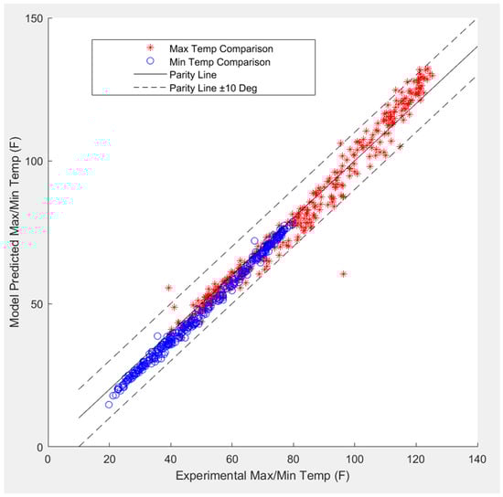 Figure 9 and Figure 10 show that the predicted cell temperatures were in good agreement with experimental data. Predicted and measured daily maximum temperatures differed by an average of 1.9 °C (3.5 °F), and predicted and measured daily minimum temperatures differed by an average of 1.5 °C (2.7 °F).