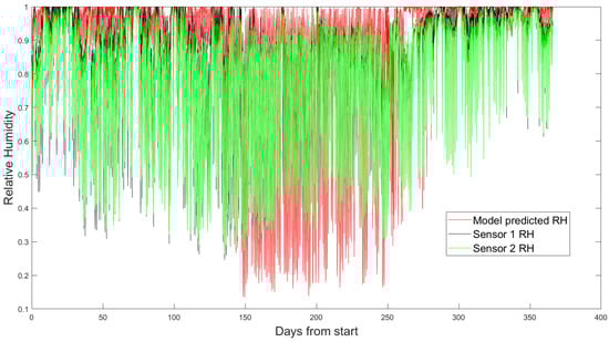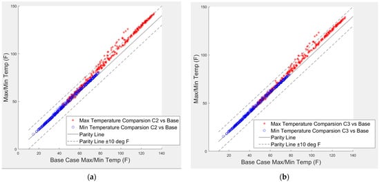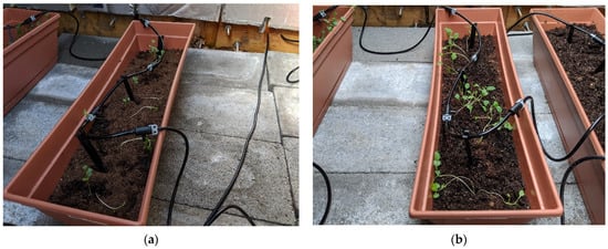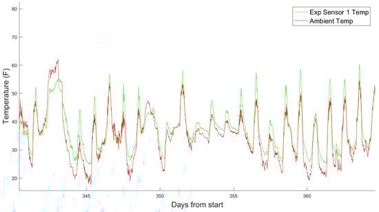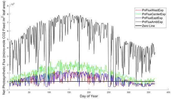 The evapotranspiration of water from the planters, Equation (A10), is modeled using the Hargreaves equation []. The Hargreaves equation predicts evapotranspiration based primarily on the maximum and minimum daily temperature. It is converted from mm/day into kg/s for the purposes of our equation, and a scaling factor of 0.525 was applied based on the parametric study, as the equation was being used in an environment for which it was not developed. It is important to note that the daily evaporation predicted by the Hargreaves equation was assumed to be constant throughout the day to convert the equation from mm/day to kg/s. The Hargreaves equation used in the present work is