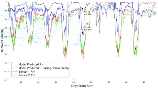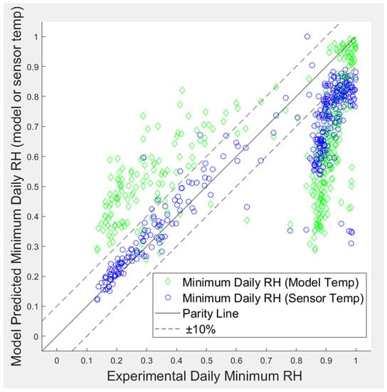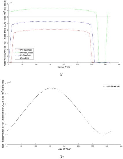 Equations (11)–(15) are used when evaporation occurs, and Equations (12)–(16) are for condensation. ETPlant is evapotranspiration from the plants. It is an adapted form of the Hargraves equation [] and is discussed in Appendix C.