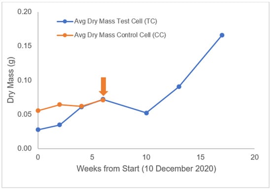 During the third growth experiment, the same measurements as those in the second growth experiment were taken. These new plants were started in March 2021 in the test cell and in the control area. The allometric function found previously was used to compare the dry mass of kale produced in the test cell and in the control area.