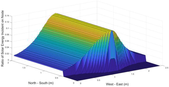 Once the values calculated in Equations (19)–(25) are known, the algorithm to determine if a point at the base of the test cell is shaded is as follows. First, a check is made to determine if the current hour angle in the simulation is before sunrise or after sunset (if so, no points are illuminated).