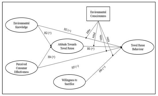 The aim of this research was to examine the influence of environmental knowledge, perceived consumer effectiveness, willingness to sacrifice, and environmental consciousness on the development of travelers’ attitude and towel reuse behavior. For this, we have proposed six direct, two indirect, and four moderating hypotheses using the theoretical lens of KAB model and ABC theory.