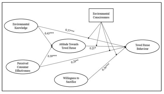 We further tested the mediating effect of attitude towards towel reuse between the association of towel reuse behavior with environmental knowledge (H7a) and perceived consumer effectiveness (H7b). The hypotheses H7a and H7b are partially supported as the direct relationship is significant in both the cases. The finding of H7a is in line with Taufique et al. [26], wherein it was found that knowledge about sustainability issues leads to the development of a positive attitude and actual behavior. The possible justification is taken from the knowledge-attitude-behavior model [11], i.e., travelers with high environmental knowledge tend to have a strong and positive attitude towards towel reuse, which in turn results into towel reuse behavior. Similarly, the finding of H7b is in line with Wang et al. [38], wherein travelers with high perceived consumer effectiveness exhibit strong attitude and likelihood of performing behavior. This finding implies that travelers with high perceived consumer effectiveness (i.e., they believe that their efficacy to solve the problem) tend to have a strong and positive attitude, resulting in actual towel reuse behavior.