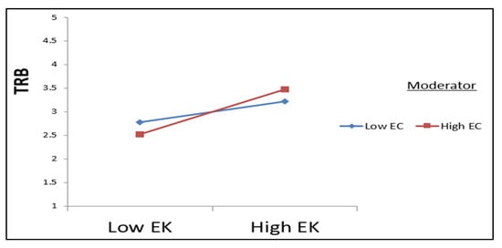 The relationship between environmental knowledge (EK) and towel reuse behavior (TRB) is significantly moderated by environmental consciousness (EC).