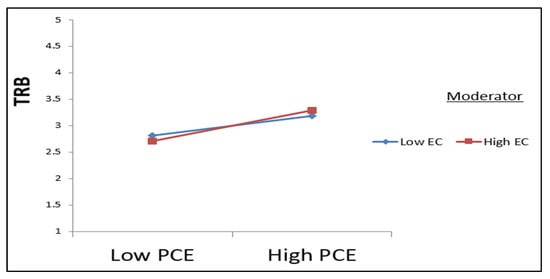 The relationship between perceived consumer effectiveness (PCE) and towel reuse behavior (TRB) is significantly moderated by environmental consciousness (EC).