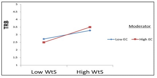 The relationship between willingness to sacrifice (WtS) and towel reuse behavior (TRB) is significantly moderated by environmental consciousness (EC).