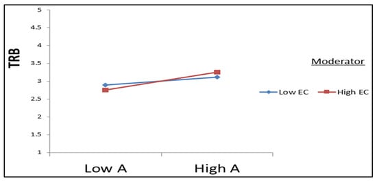The relationship between attitude towards towel reuse (A) and towel reuse behavior (TRB) is significantly moderated by environmental consciousness (EC).