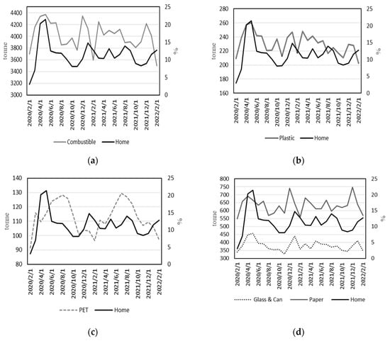 Plots of the volume of waste in Minato City, Tokyo, with changes in stay-at-home hours: (a) Combustible waste; (b) Recyclable plastic; (c) PET; (d) Glass Bottles, Cans, and Paper. Source: Minato City homepage.