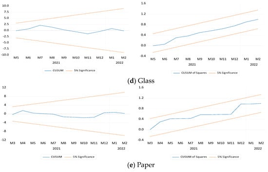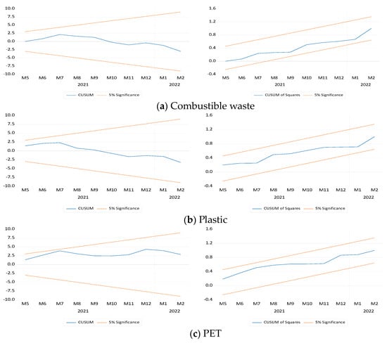 Before finalizing the estimation models, the residuals and stability of the models were checked. The Breusch–Godfrey (BG) and Breusch–Pagan–Godfrey (BPG) tests were applied to check for autocorrelation and heteroskedasticity in the residuals for the five waste models. The test results are illustrated in Table 5, which show that none of the test statistics became significant. This indicates that all of our waste models were free from autocorrelation and heteroskedasticity issues.