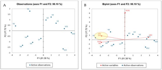 A certain level of production is required for a profitable mushroom crop, which is estimated at 30–40 kg sqm−1 []. When viewed from this point of view, it can be seen that for all 12 variants analyzed, and the average yield falls within this range (30.7 kg sqm−1 for V12 and 42 kg sqm−1 for V5). The exception is V10, which is slightly below this limit (29.3 kg sqm−1). It can also be seen that the highest average yield, exceeding 40 kg sqm−1, is found for the variants with synthetic compost (V4, V5, V6).